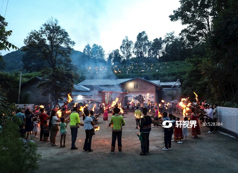 7月22日,在会理市小黑箐镇白沙村,当地群众围着火把载歌载舞。当日,四川省凉山彝族自治州会理市小黑箐镇白沙村举行火把狂欢、蹢脚舞、“筛糠”等丰富多彩的民俗活动庆祝彝族火把节。