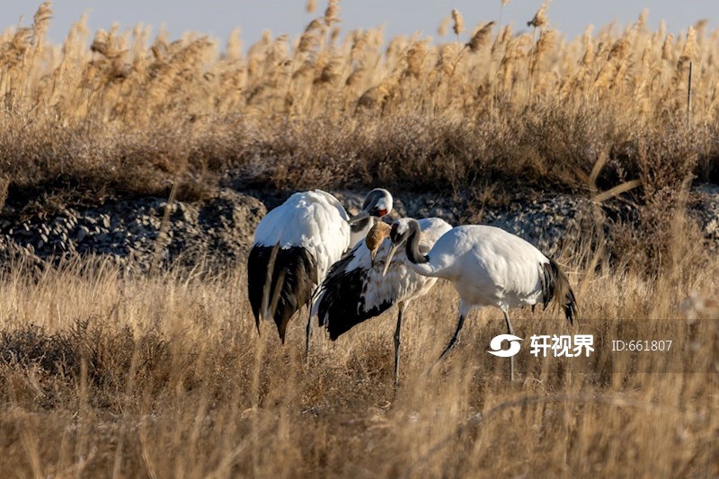 2025年12月8-9日 ,黑龙江省大庆市林甸县红旗镇,东扎龙保护区国家一级野生保护动物丹顶鹤,在草原上觅食栖息。