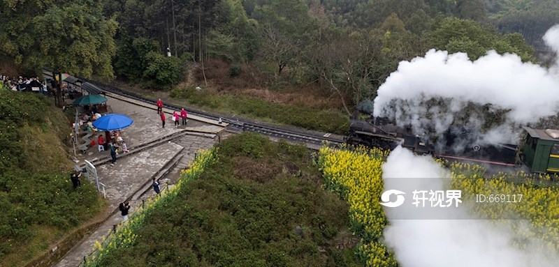 2026年2月28日,四川省乐山市犍为县,嘉阳小火车穿行于烂漫花海之间,迎来春季旅游旺季,众多中外游客慕名而来,乘坐这列被誉为 “开往春天” 的小火车打卡观光。
